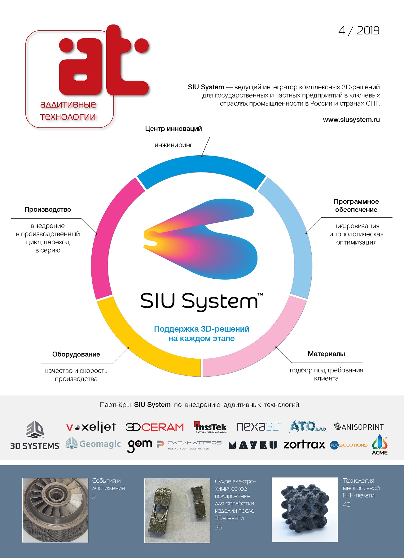Компания SIU System была основана в 2008 году, за 11 лет стала ведущим экспертом на рынке аддитивных технологий. Компания имеет огромный опыт поставок и обслуживания оборудования, создания аддитивных центров, проведения НИОКР, аддитивного инжиниринга и консалтинга, а также реализации уникальных проектов на базе собственного аддитивного центра в Москве. Клиентами компании являются крупные корпорации, торгово-промышленные компании, ведущие ВУЗы России и СНГ.
